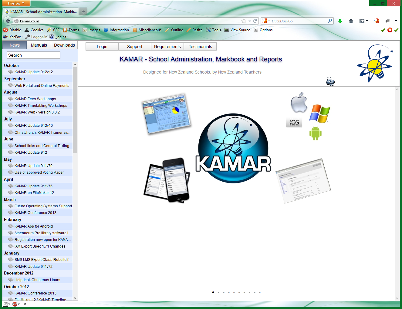 The website is designed to provide easy access to current news items, manual pages describing features of the software and downloads for the KAMAR software and the support software necessary to run it, to staff using the KAMAR software in their school.