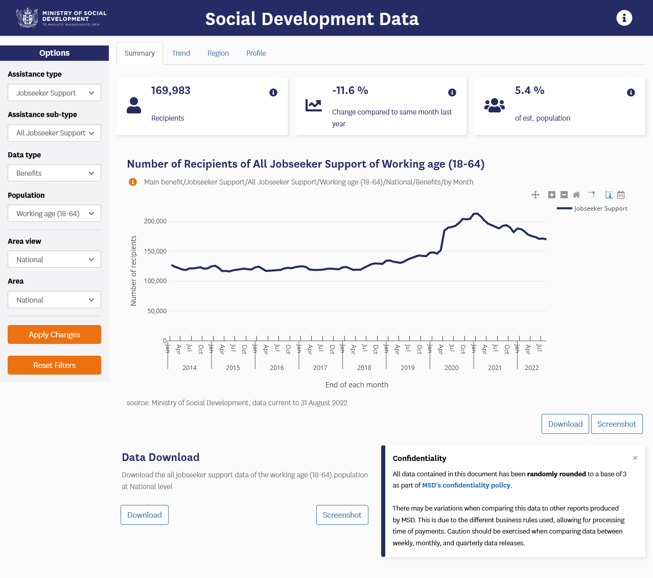 The Social Development Data application is a tool for exposing data that the Ministry of Social Development holds about numbers of people receiving benefits.